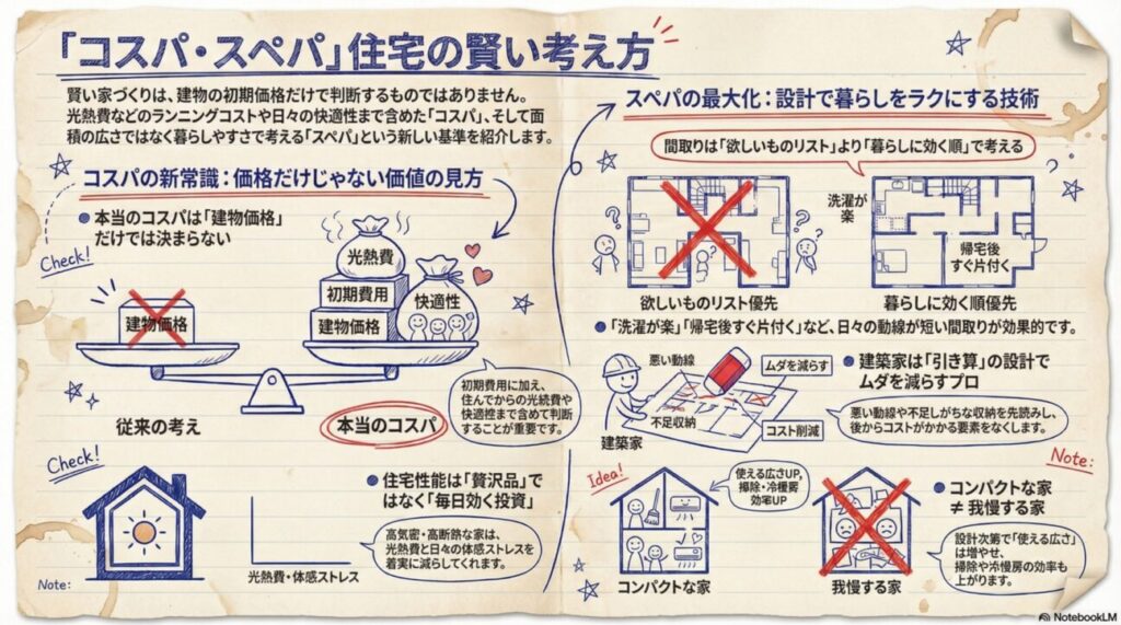 そこで今回のテーマが、**コスパ・スペパ住宅(コストパフォーマンス+スペースパフォーマンス)**です。