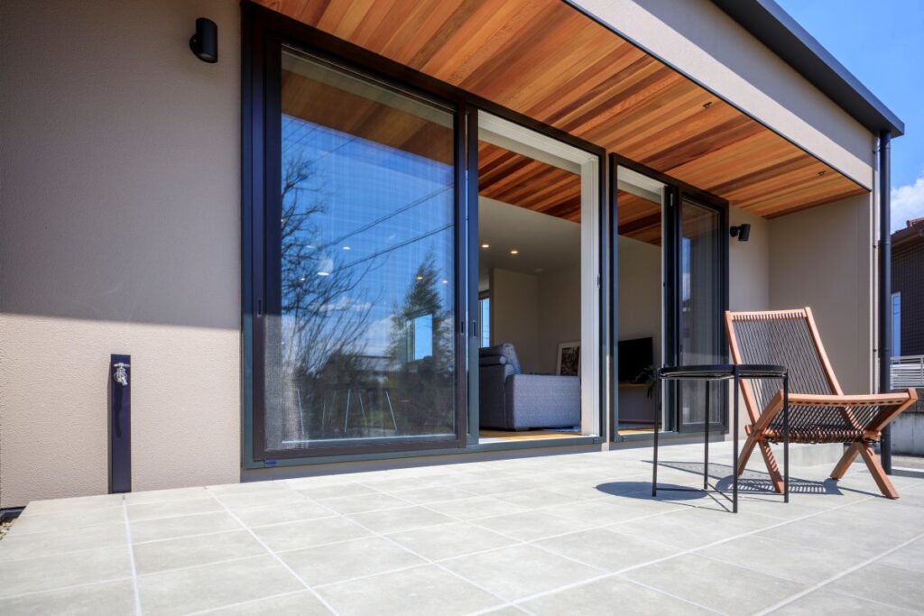 玄関から続くタイル土間が、外の景色と自然につながる開放的な空間を演出。