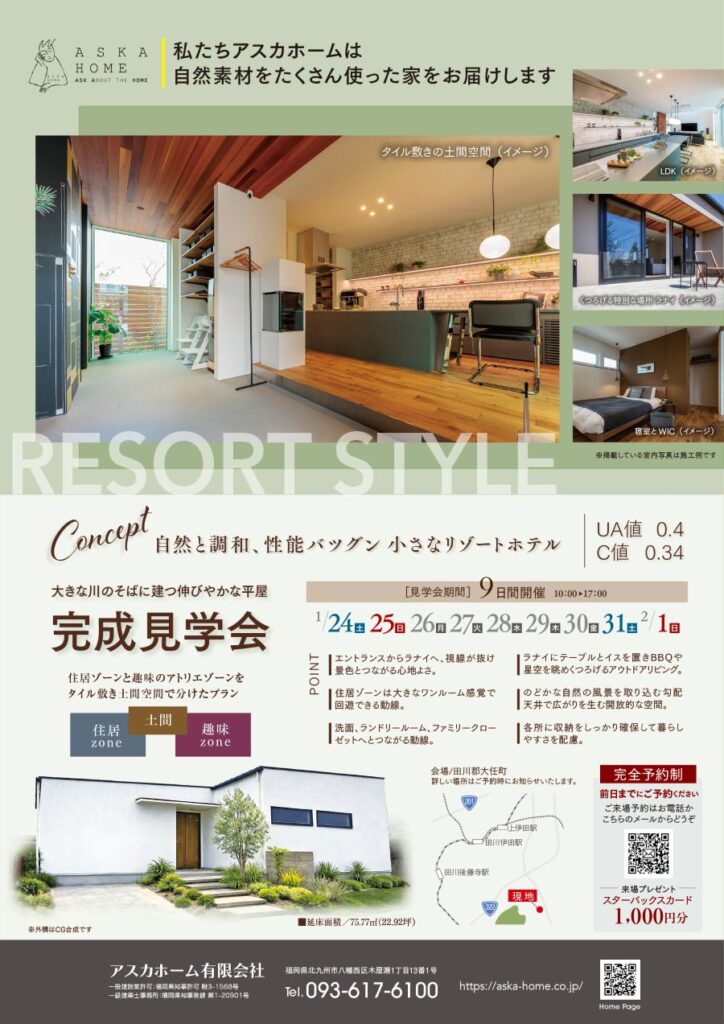 【福岡県田川郡大任町】「自然と暮らす、小さなリゾートホテルのような平屋」 注文住宅 完成見学会!