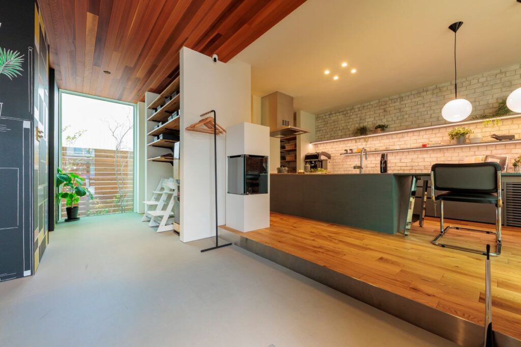 住居ゾーンと趣味の部屋をつなぐタイル敷きの土間空間。住居ゾーンは、大きなワンルーム感覚で各部屋を回遊できるストレスフリーな動線で、家族が自然につながりながらも快適に暮らせる間取りです。