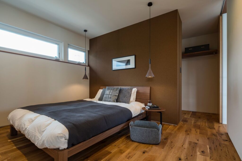 木のぬくもりを感じる床と、深みのあるアクセントウォールが一日の疲れを癒してくれます。窓から入る柔らかな光と、計算された照明がつくる穏やかな明るさ。眠る上質な時間を大切に考えた、心から寛げる寝室です。