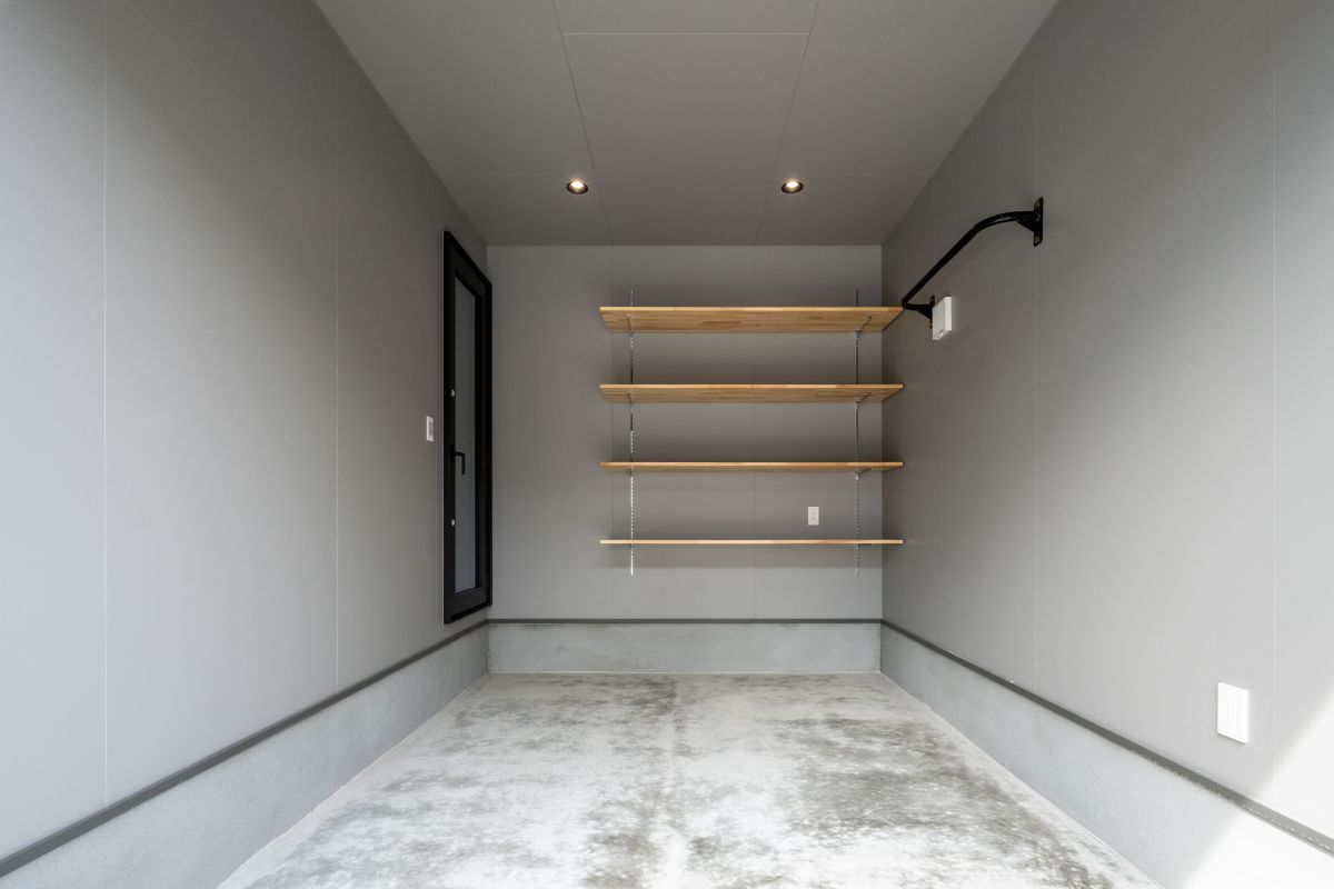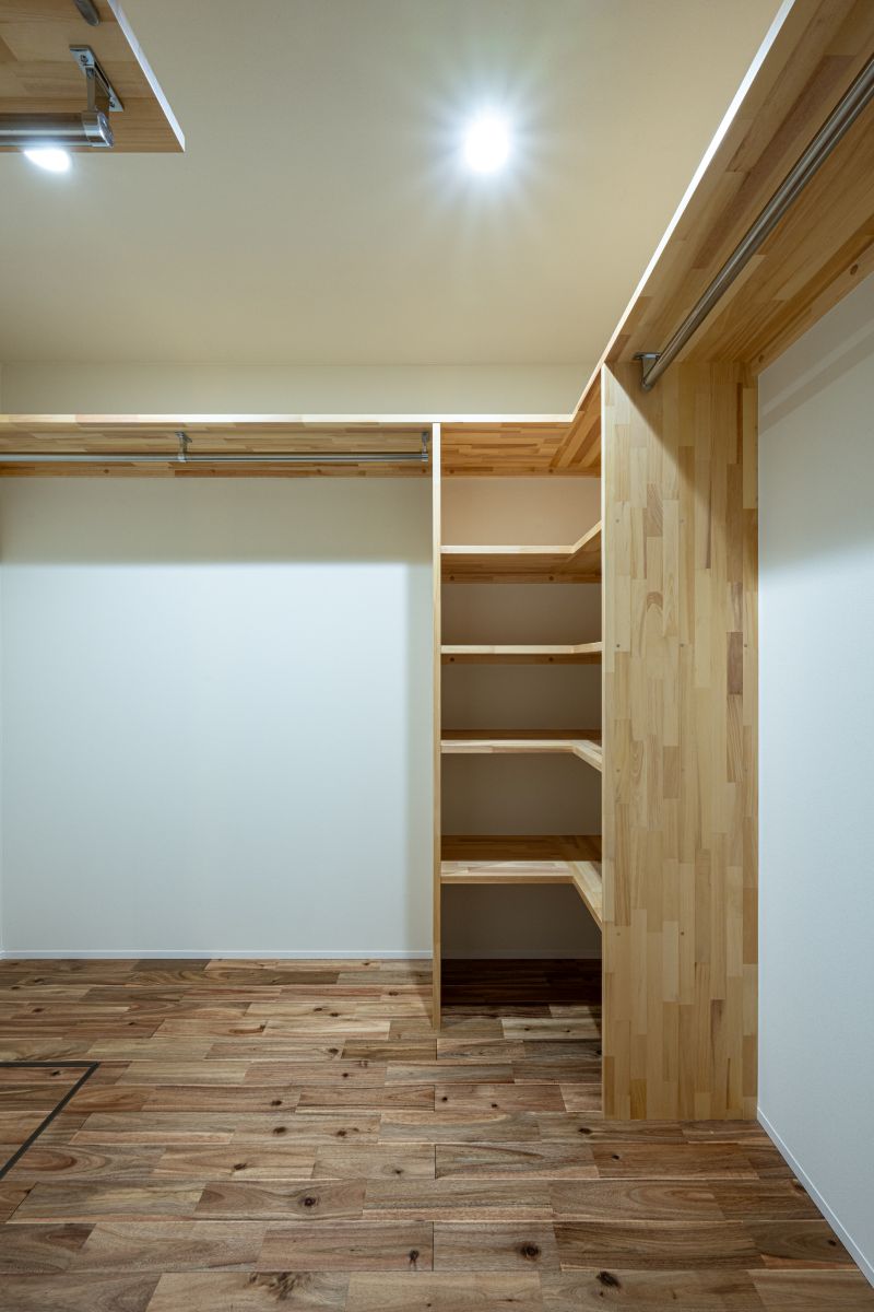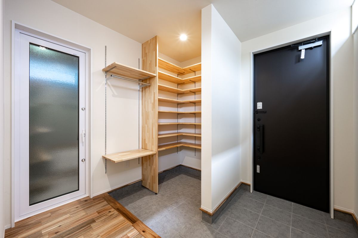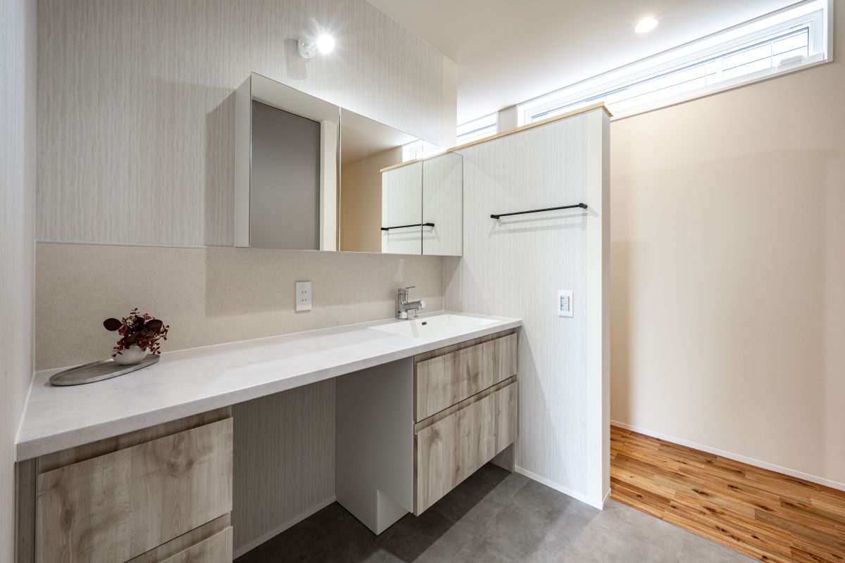 ゆったりとした敷地を活かし、不整形地という条件を逆に魅力へと変えた住まいです。玄関にはシューズクロークとバイクガレージを隣接し、帰ってすぐに手洗いや片づけができる便利な動線を確保しました。ランドリーの北側にはサービスガーデンを設け、人目を気にせず外干しできる工夫も取り入れています。