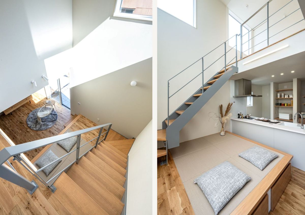 小上がりから上がる鉄骨階段の色はお気に入りのグレー。リビングの一角に設けた小上がりは、ソファを置かずベンチのように活用できる多目的スペース。床下は収納になっており、空間をすっきりと保ちながら心地よく過ごせます。キッチンにも面しているので、すぐに食事ができ忙しい朝も片づけがスムーズです。小上がりから続く鉄骨階段と、吹抜け、高窓から差し込むやわらかな陽光が、リビングに明るさと開放感を添えています。