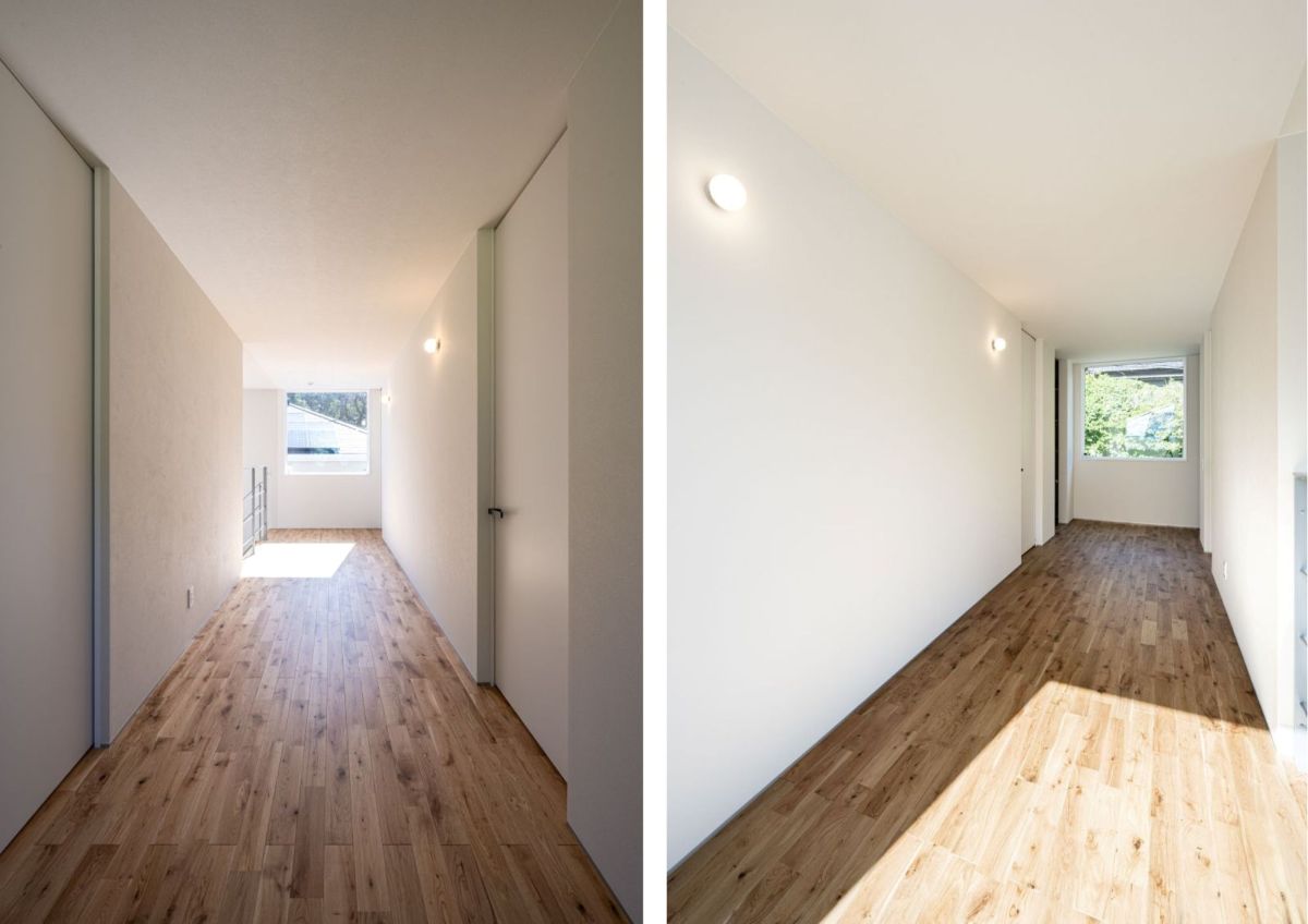 2階へ上がると、スクエアの大きな窓から穏やかな景色が目の前に広がるピクチャーウインドウ。外からの視線を気にせず過ごせる、まるで隠れ家のようなプライベート空間。廊下でありながら、広めに設けた多目的スペースは、お気に入りの椅子やテーブルを置いて読書やコーヒーを楽しんだり、ハンモックを吊ってゆったりくつろいだりと、使い方はさまざま。自然の光と景色に包まれながら、心も穏やかになる癒しの時間を過ごせます。